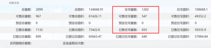 整体来说,合计1202套房源,已售房源655套,可售房源547套,去化率54.49%。