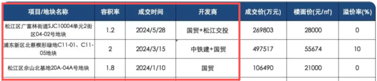 2024年1月10日,国贸10.649亿元竞得松江区佘山北基地20A-04A号地块,溢价率0%,成交楼板价21000元/平方米,地块房地联动价49000元/平方米。