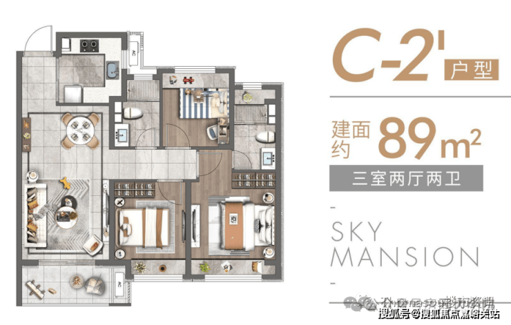 建面约89㎡(三房两厅两卫)