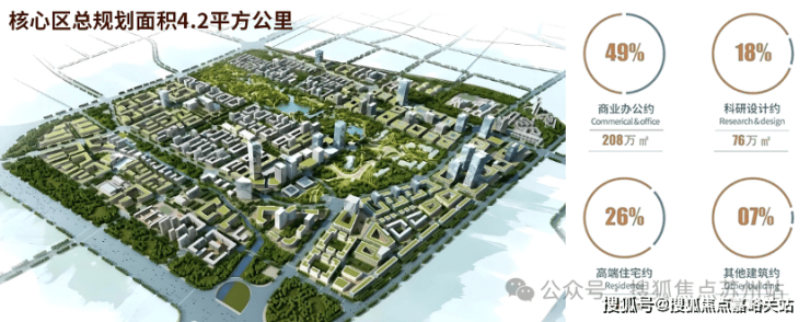 1. 媲美张江的产业规划占比:桃浦智创城核心区总规划面积4.2平方公里,商办+研发比例更是高达22.1%,甚至超过了张江科学城的21%。其中商办体量更是超过了197万㎡的前滩和126万㎡的新天地。