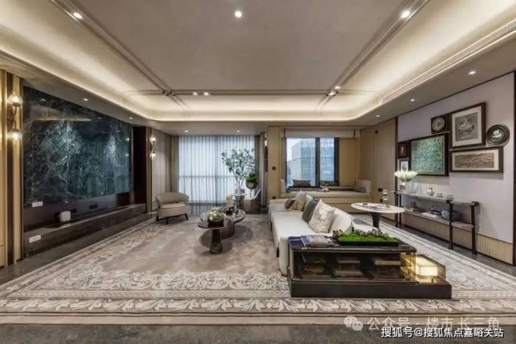 在装饰细节上, 从天花板的曲面吊顶、墙体的圆角过渡,到定制家具的流畅线条,都在诉说喜曲不喜平的优雅,天花吊顶,更有刻槽工艺,融入项目logo,赋予业主独一份的尊崇。