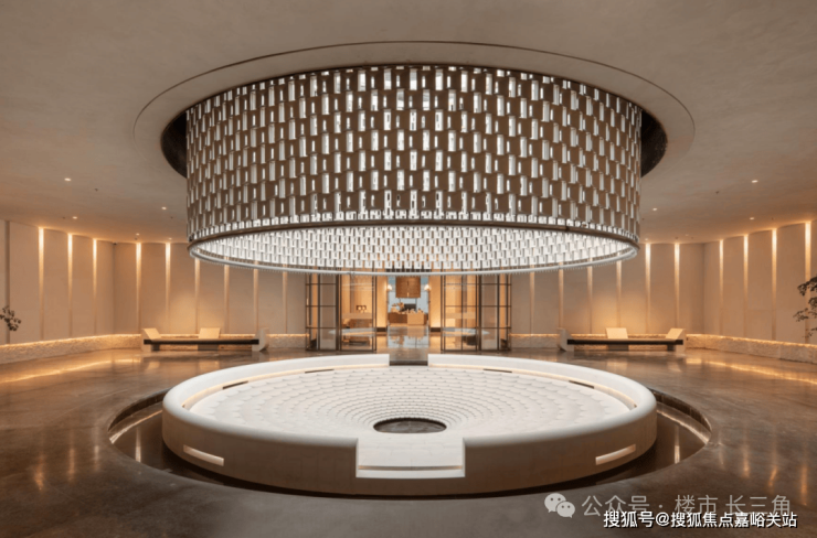 浮光池院水院会客厅,现已实景呈现,水景中央的艺术小品,如一滴水在湖面晕开,泛起阵阵涟漪。