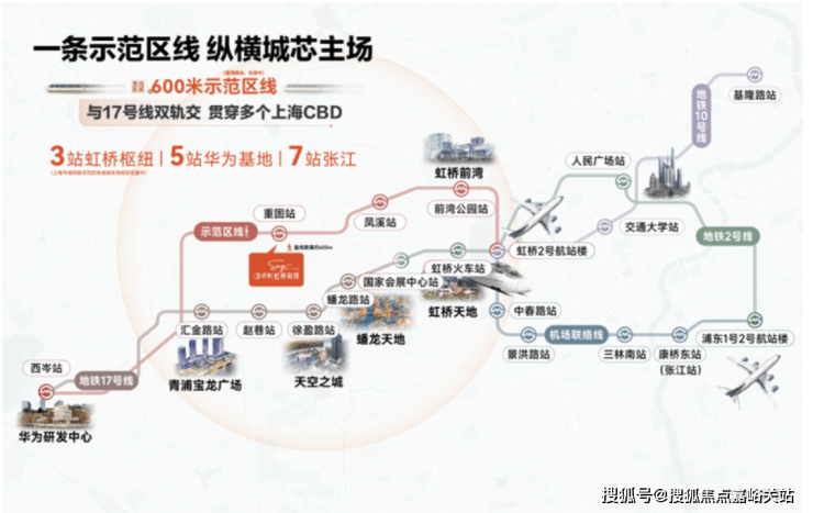 而示范区线(在建)左手长三角一体化、华为,右手前湾、大虹桥总部商办,并通过虹桥枢纽,串联2号线及正在试运营的机场联络线,把市中心、徐汇、闵行、张江等高能板块都纳入保利虹桥和颂·IN255的通勤版图。
