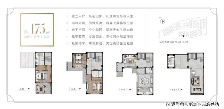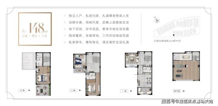 地上三层+地下一层,打造适合中国人家庭结构的4层合院。一层的餐客空间,二楼百变2房,三层独享整层套房式设计,容纳三代人居住。