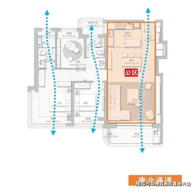 这个户型的动、静分区非常明确,几乎各占一半,用 “泾渭分明” 形容一点不为过。 动区采用了LDKB一体化的设计,视线一览无余。(如下图)