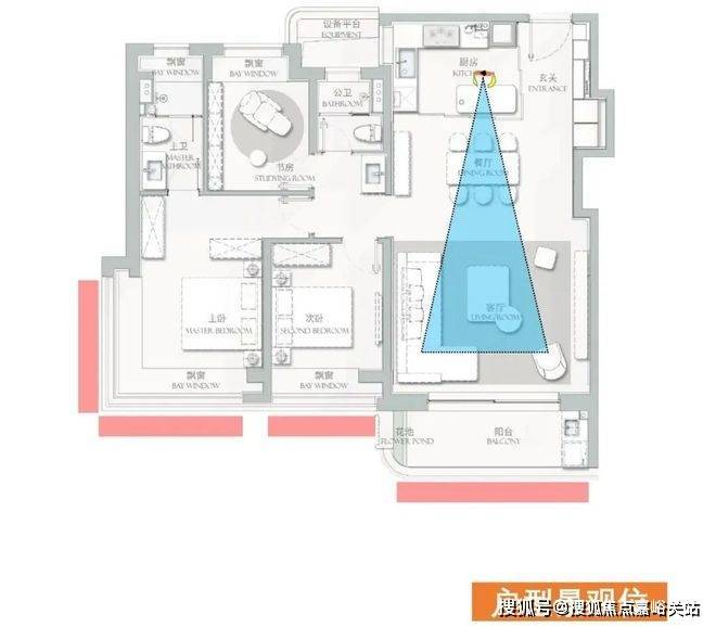 户型南侧为景观位置,能眺望黄浦江,所以除了常规设置之外,还在主卧设置了非常大的转角飘窗,最大限度的利用好景观资源。(如下图)