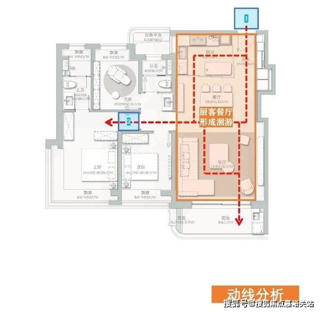 在交通流线方面,考虑引入了“洄游”动线的设计,这样可以起到串联空间,提高家务效率的同时,当然还能让空间“显大”!(如下图)