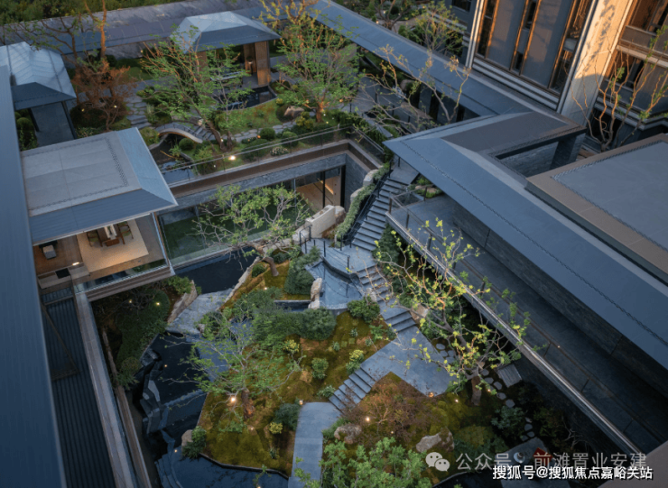 再往里走就是近460㎡的下沉式庭院,精选太行山金景石堆叠成小山丘,引进溪水汇聚成池塘,并移栽岭南珍贵的古桩铁冬青和中华原生乌桕树,形成一幅立体山水画卷。