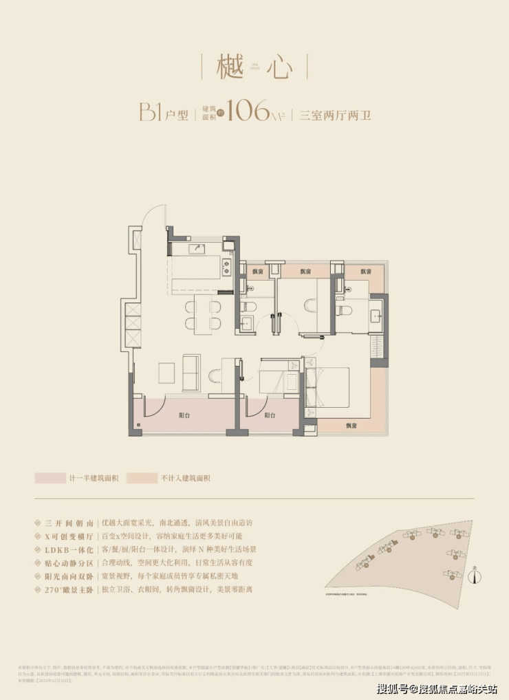 建面约106㎡的三房两厅两卫, 3.5开间朝南,南向面宽达到约11.8m! 碾压市面上以前的三开间朝南、10米面宽的三房户型。