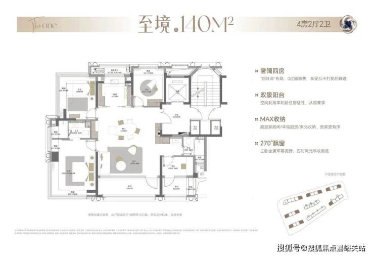 约140㎡户型采用经典“四叶草”布局,四个卧室分布在四个角落,家庭活动核心居中——私密性高、空间零浪费、通风采光好,多口之家互不干扰。