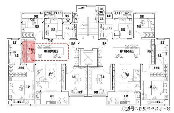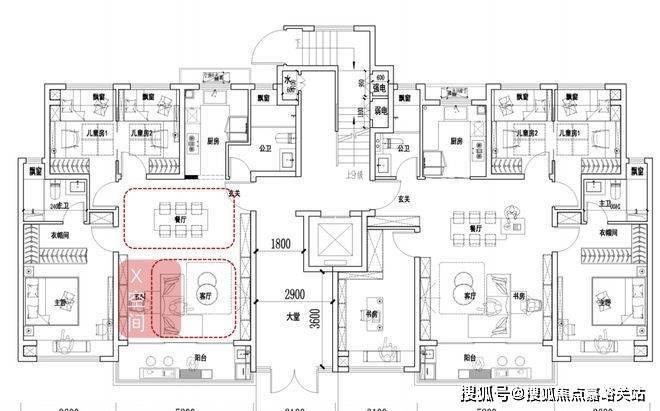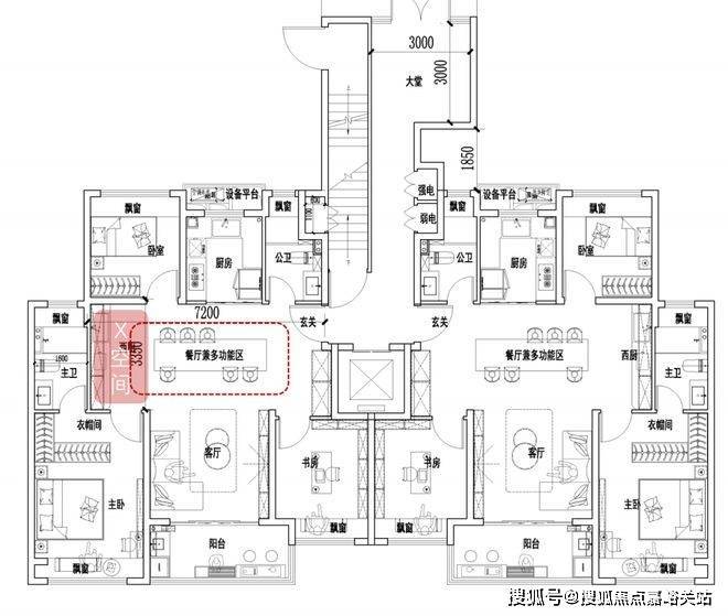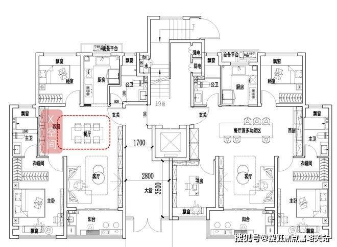 一梯两户,四叶草户型,三开间朝南,全卧飘窗,约5.2米小横厅!