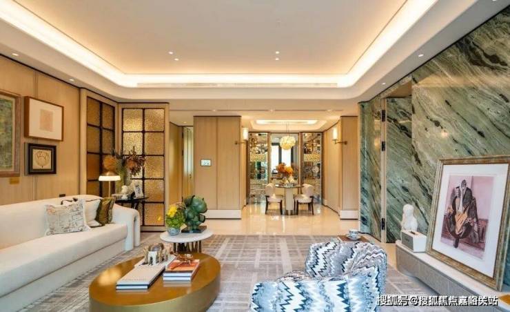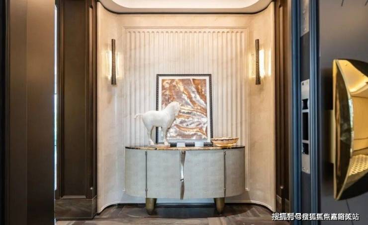 例如入户玄关铺设有“石材皇后”鱼肚印象,这种级别的奢石在很多顶豪项目中通常仅作局部镶嵌