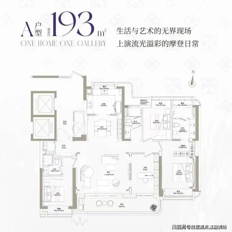 193平方米四房:270°环幕视野,主卧与客厅双面采光,层高3.15米,两梯两户设计。