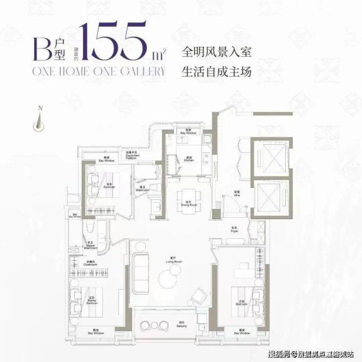 155平方米三房:三开间朝南,6米景观阳台,主卧套房面积25平方米,配独立衣帽间与卫浴。