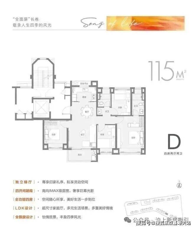 建面约115㎡4房2卫户型做到了同面积段罕见的四开间朝南+四房设计,南向IMAX级景观面,卧室阳光满溢,功能性也拉满。