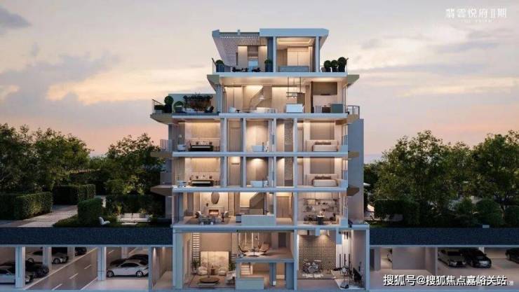 更为重要的是,翡雲悦府·悦墅Ⅱ期通过 "三重立体庭院体系" ,实现了墅居庭院平权: 下叠拥享私家庭院 ,可打造花园秘境、亲子乐园或社交庭院; 上叠配置空中悬浮庭院及顶层星空露台庭院 ,实现有天有地的墅居理想,告别传统叠墅"有墅无院"的遗憾。