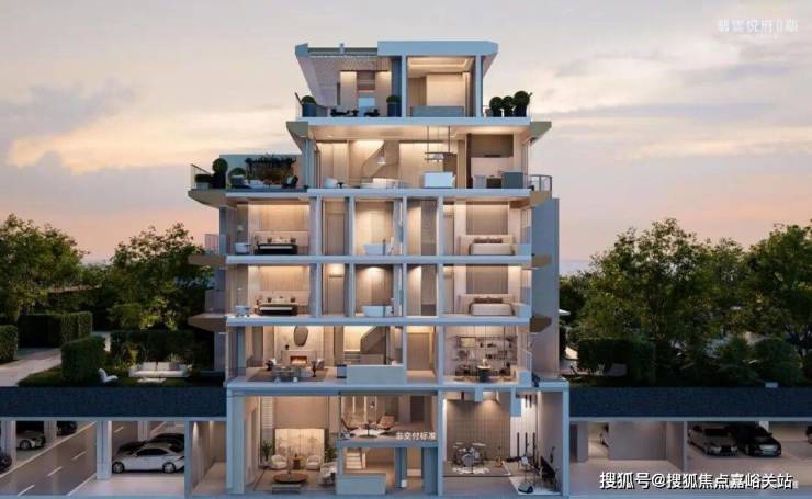 在建筑形态上,项目以全新结构形态, 创新打造"流瀑五叠"形制与"二跃三"立体格局 。五层建筑如水瀑般层层递进,打破呆板堆叠;二跃三格局让上叠拥有了完整的三层空间,彻底告别"阁楼+露台"的局限。