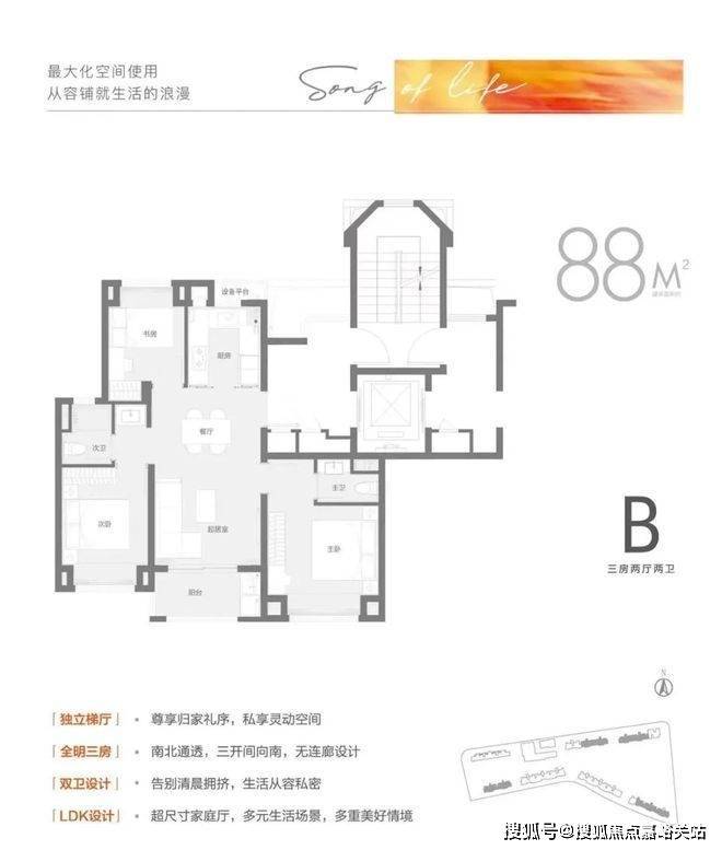相较于市面上普遍的建面约88㎡只能做3房1卫的设计,该户型竟做到惊人的3房2卫!
