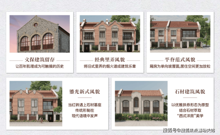 全上海第一个多元化形态风貌别墅新房 , 五大经典建筑立面 复刻百年风貌 Art Deco 神韵,包括文保建筑留存、经典里弄风貌别墅、平脊范式风貌别墅、鎏光新式风貌别墅和石材立面风貌别墅。
