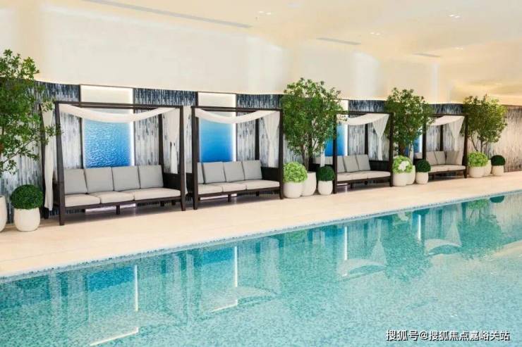 项目利用下沉式景观庭院,结合艺术花园、摩登水景等,打造了一座建面约1200㎡的高端下沉式会所,规划设有泳池、健身房、行政酒廊等场景。