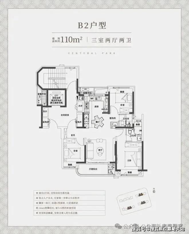 建面约110㎡中间套竖厅户型,同样也是标准的南北通透飞机户型,整体室内的采光、尺度感、通风都相当出色。非常适合一家三口、年轻夫妻的全生命周期需求!