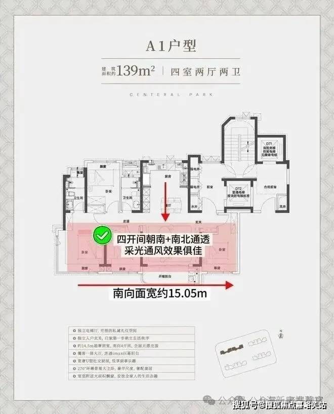 建面约139㎡的户型(西边套),独立电梯厅+罕见的大横厅设计,大面宽短进深,约15.05m的南向奢阔面宽,无论是采光感、尺度性都拉到了极致,享受城央豪宅级别的采光。