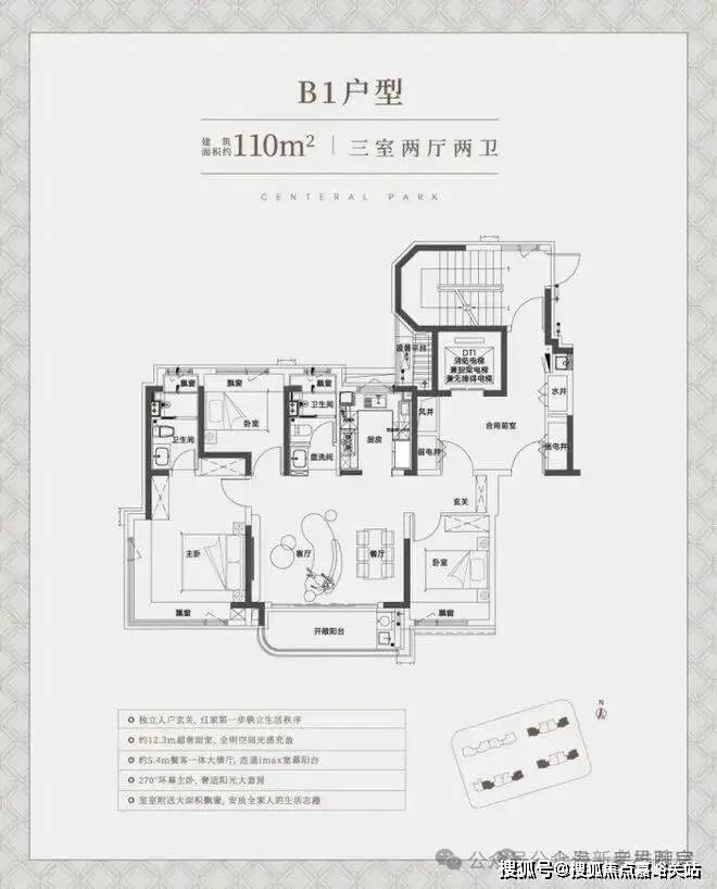 建面约110㎡三房边套户型,约5.4m超大横厅、南向面宽做到了惊人的约12.3米,堪比别墅级别的产品!巨幕阳台+边套270°景观视野,空间体验与采光感拉满!