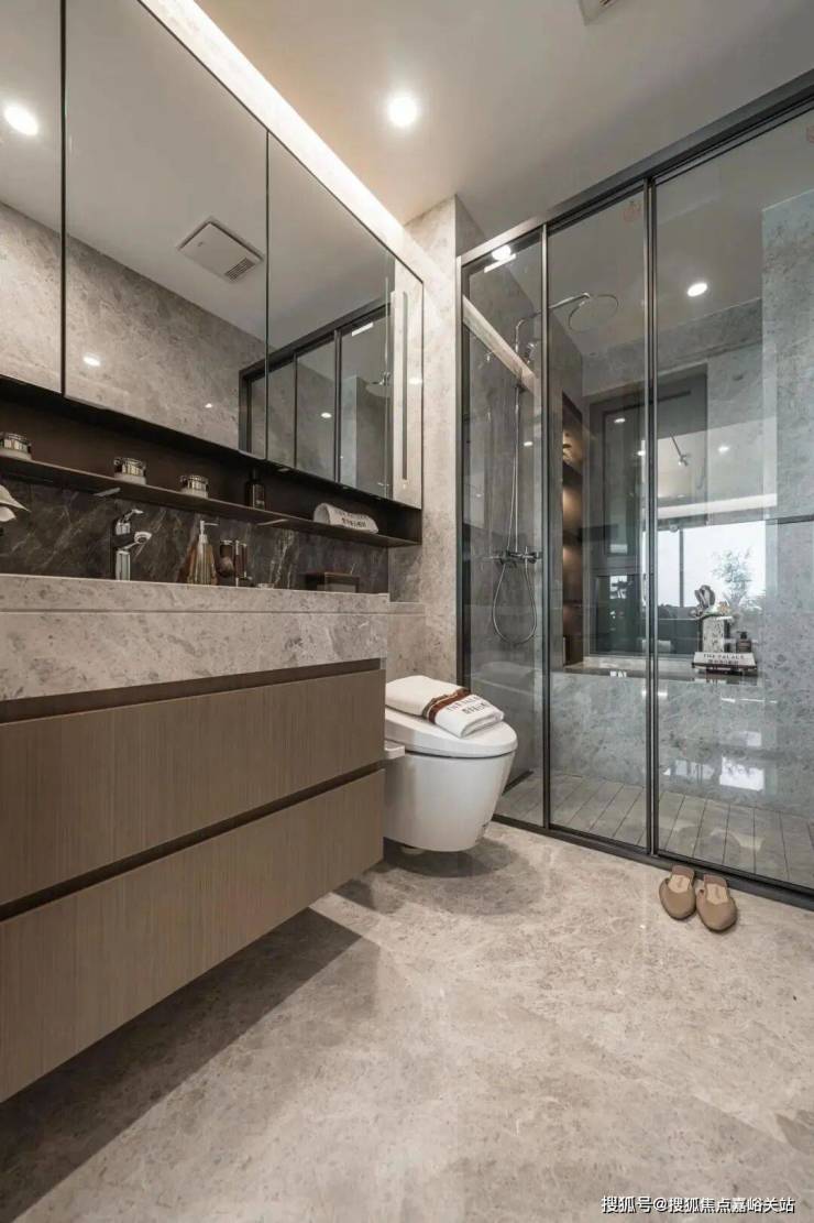 所有户型全屋墙纸交付,连电视机背景墙岩板以及主卧背景墙都是交付标准,卫生间甄选不同的石材,以此来满足功能区的需求。