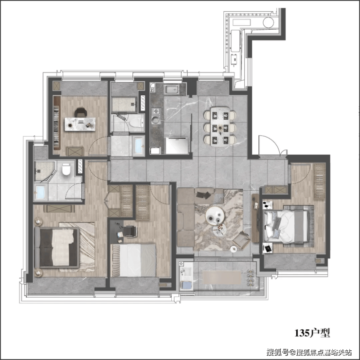 该户型贴合当代人居生活习惯,既适合三口之家小太阳家庭,也可以是三代同堂,每个人都能拥有独立空间。