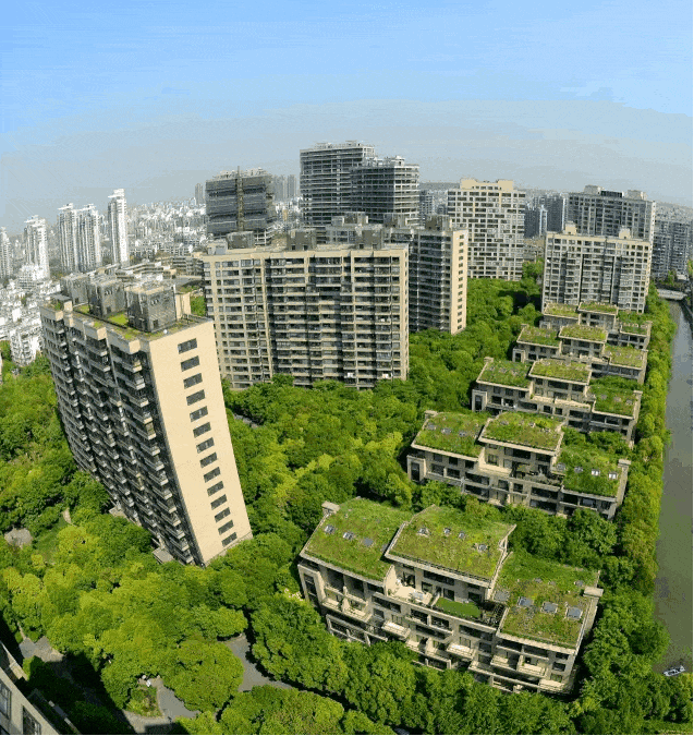 整个社区都是绿色森林,树海环抱,连底层都挑空6~9米,种植绿色,让每户人家都能“开窗见树”,让房子生长在森林之上.