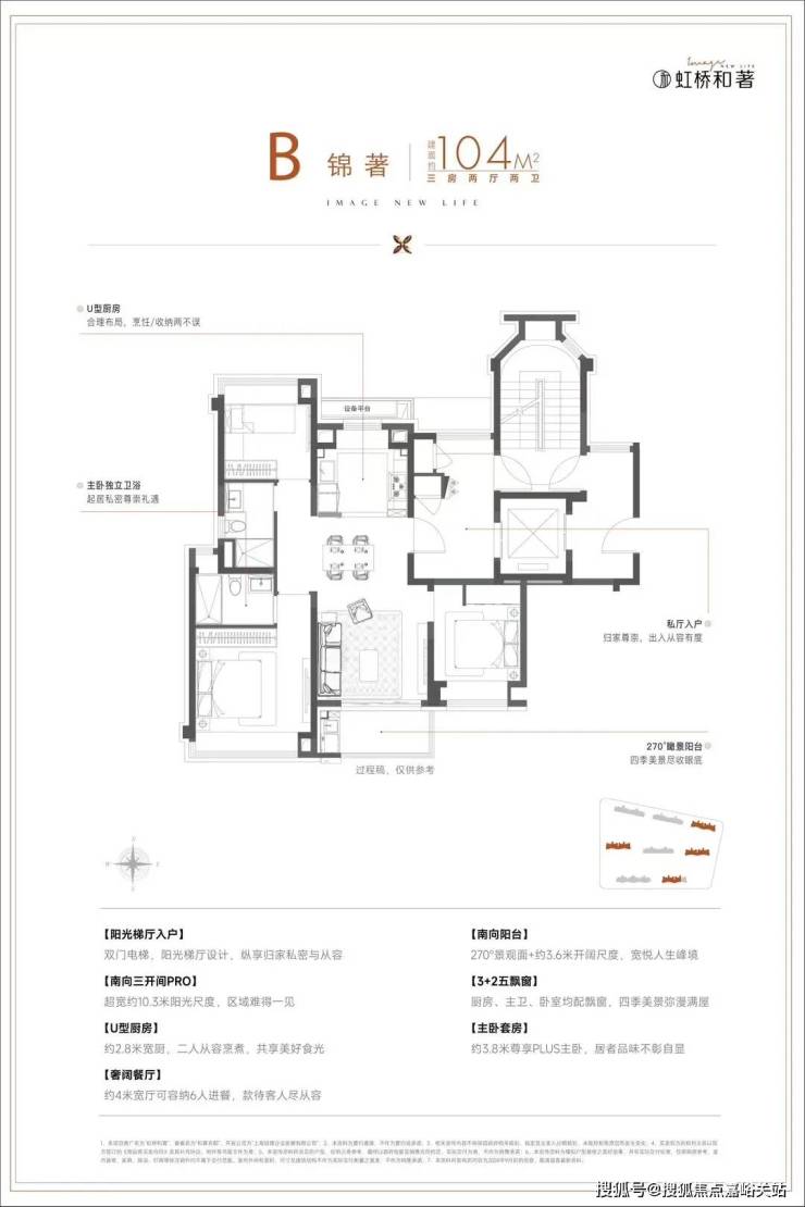 建面约104㎡3房,在建面94㎡小3房优点上,又进一步升级了尺度感,约10.3m的南向面宽,为室内带来了出众的采光面和尺度感,这个户型无论从实用性、尺度感,亦或是视野、采光、私密性来说,都做得相当优秀。