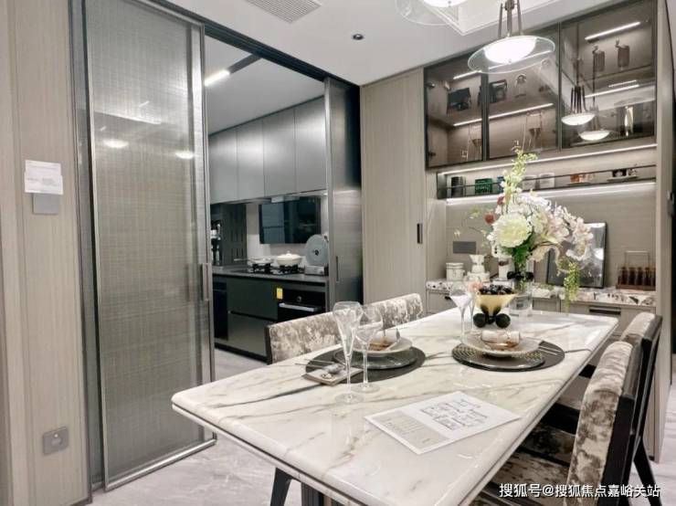 餐厅区域放置一个餐边柜,同样选用了雪山飞狐奢石做透光台面设计,餐边柜在收纳储物方面具有显著作用。越秀杨浦天玥售楼处电话:400-9975-759