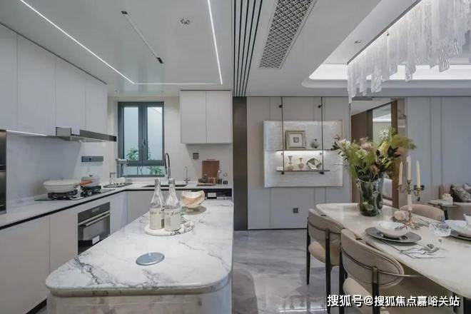 进门可以看到经典的S墙设计,L型厨房操作台面,也是暗藏不少细节——玻璃移门采用完美系列夹丝玻璃+金属造型边框,顶部配置线性凉霸+LED嵌入式回形灯带+筒灯,灶台后侧采用大面积岩板铺设,方便清洁的同时显得厨房更加大气。
