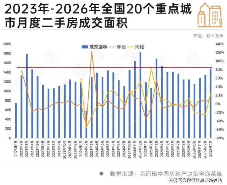 数据显示,2026年1月,重点20个城市二手房成交面积1483万平方米,环比上涨10%,同比上涨25%。