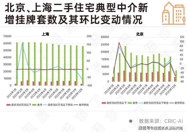 数据显示,上海二手住宅月度典型中介新增挂牌套数自2025年5月起明显下滑,其中,总价300万以下的挂牌量下滑幅度明显高于全市二手房挂牌量。北京也呈现出同样的趋势,总价300万元以下房源挂牌量降幅大于全市二手房挂牌量。