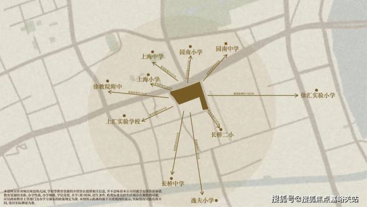 距上海“四校”之首的百年名校——上海中学直线距离仅约320米;距园南中学直线距离约650米,该校近年来中考升学成绩在徐汇区排于前列,连续三年中考区内公办第一;距公办二梯队小学园南小学直线距离约400米,对口初中即为实力不俗的园南中学;距九年一贯制上汇实验学校直线距离约500米,虽为成立于2021的新校,但作为上海中学的“亲孙子”,其影响力早已扩张开来。