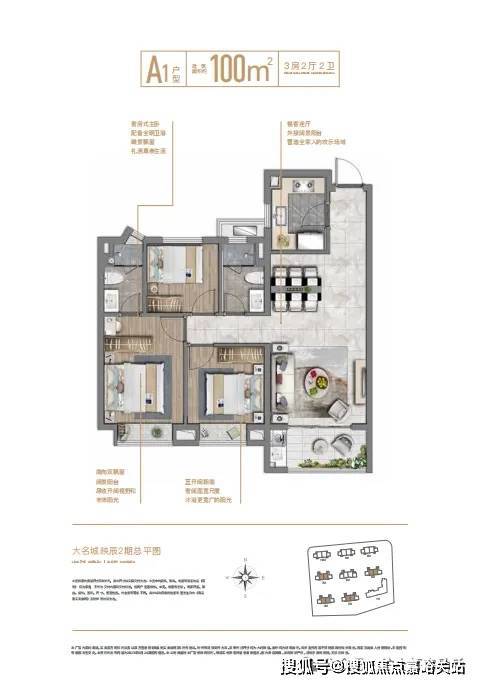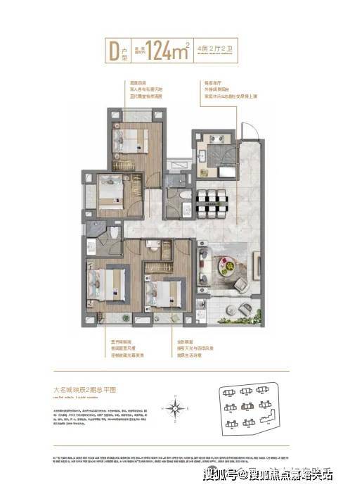 其中,124㎡的四房户型配备了 270°L型飘窗, ℳ大名城映辰售楼处电话:400-8894-986ℳℳ提供极佳的观景体验。约3米的层高和南向双卧室+北向多功能房的布局,既能满足二孩家庭的分龄需求,又为居家办公等提供了可能性。