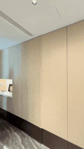 地面使用了900*1800mm的超大尺寸岩板砖,不同于其他地砖,这个岩板砖无论贴多少片就像一整片的效果,只有在希尔顿酒店和万豪酒店中才会用到,而且需要专人铺贴,难度和成本极高。