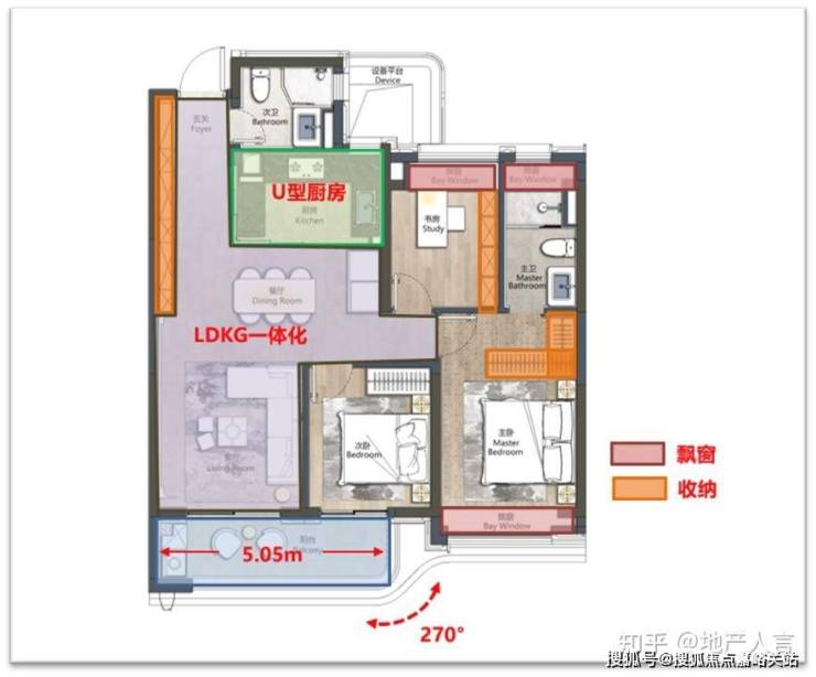 在建面约105㎡户型中,他们把传统放在北面卧室隔壁的客卫,挪到了入户门一侧,然后通过LDKG一体化设计,做出1个南向面宽超5米的贯通式宽景阳台,以及1个270°转角窗。