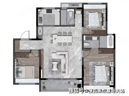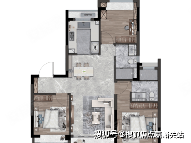 经典飞机户型,三开间朝南,南向面宽约 9.8 米,客厅连宽景阳台。主卧套房带独立卫浴,双卫全明干湿分离。得房率约 82%,空间零浪费,总价约 369 万起,高性价比一步到位。