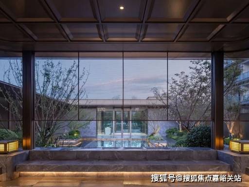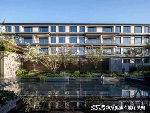 现代东方美学立面,浅灰石材搭配古铜金属线条,融入格栅、挑檐等中式元素。公建化质感、大面积玻璃幕墙,线条简洁典雅。楼间距最大约 50 米,无连廊设计,采光通风与私密性俱佳。