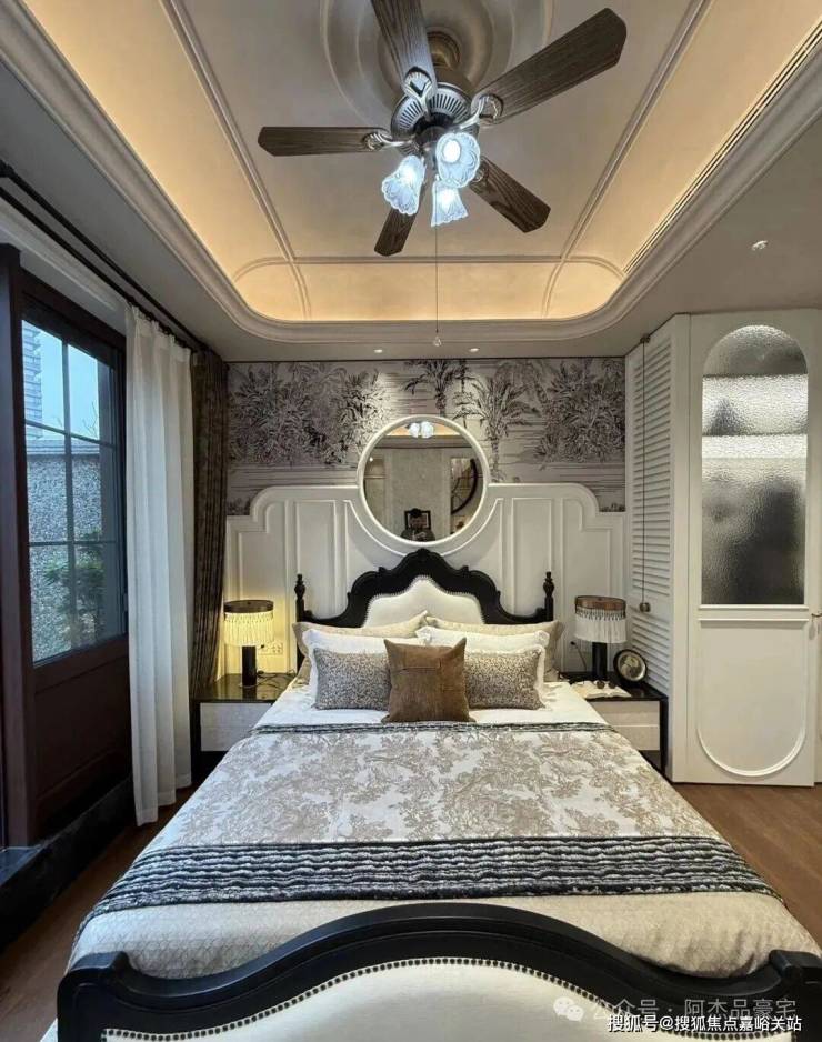 利用本身超大面宽属性,做出非常大的落地窗 ,这些窗又用很多传统的线条将它进行分割装饰,连续方格长窗,既保障了室内通透采光,又还原了花园别墅的线条美感与风情。