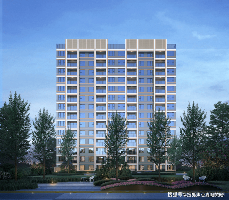 项目建筑为现代极简风格,外立面采用多彩真石漆+香槟金色铝合金线条,顶部的塔冠设计是标志性特点。