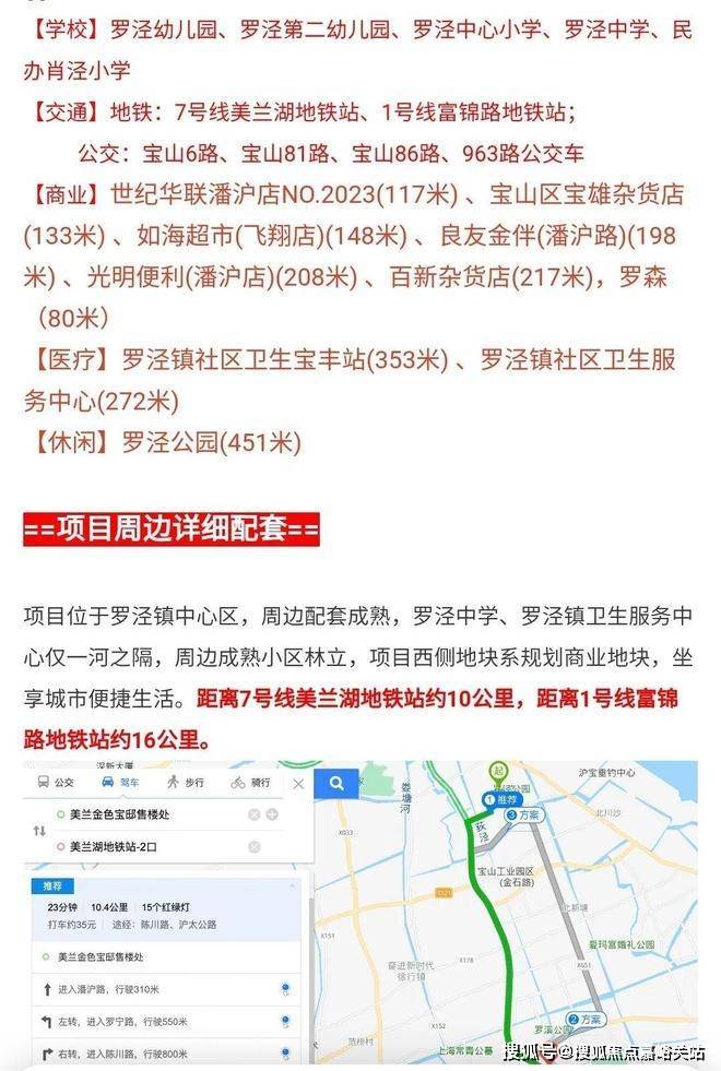 项目位于罗泾镇中心区,周边配套成熟,罗泾中学、罗泾镇卫生服务中心仅一河之隔,周边成熟小区林立,项目西侧地块系规划商业地块,坐享城市便捷生活。 10分钟内接驳轨道交通7号线美兰湖站及1号线富锦路站,尽享成熟便捷交通,出行无忧。