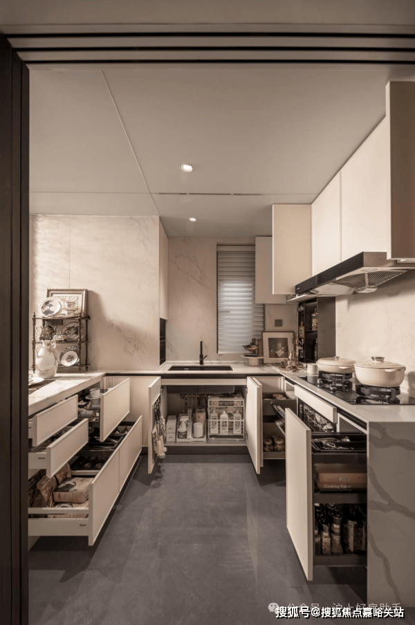 厨房更是堪称美食达人的天堂,集成一系列多功能调味拉篮、定制谷物抽屉等,收纳有序,油盐酱醋间的分类放置烦恼一次性得到解决,琐碎繁杂不再。