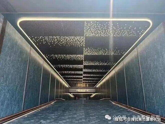 星空连廊的顶面采用香槟金铝板、墙面为爱马仕灰仿石砖,并镶嵌金属线条、就连地面都采用了夜里雪仿石砖