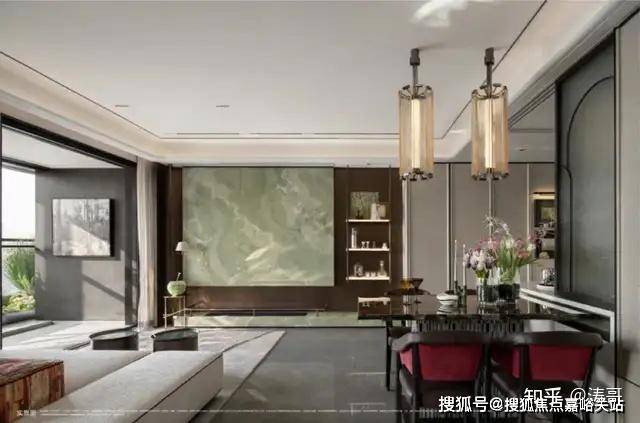 同时色彩与材质运用上也更加时尚和年轻化,古青玉岩板+金属板背景墙,玄关木饰面做了精心雕琢,主卫背景墙是奢华的马赛克拼花石材等……