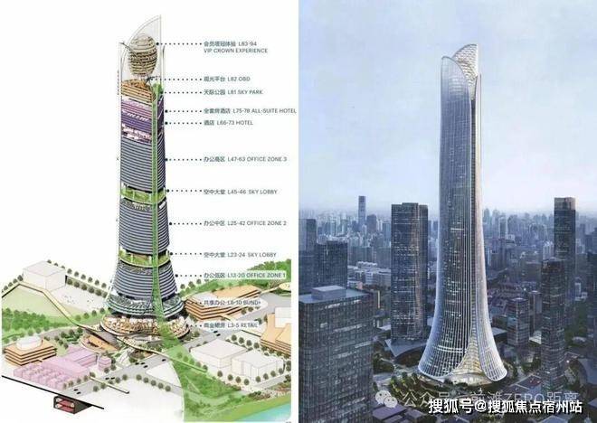 这栋建筑面积近45万m²,地上99层、地下4层,业态涵盖办公、商业、五星级酒店,还规划有停机坪的“ 浦西之巅”超级地标