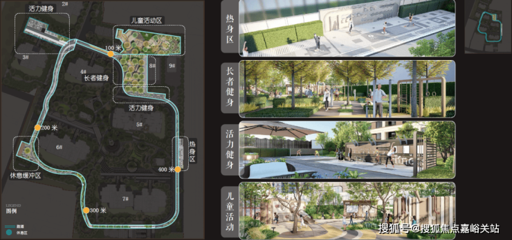 五大运动活力系统: 热身区、定制主题儿童活动区、老年健身区、活力健身区和休憩缓冲区,并由约400M跑道串联