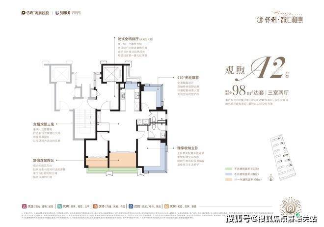 约98㎡3房:类一梯一户、全屋飘窗为标配,双阳台+花池是核心亮点(市面双阳台户型起步多为约110㎡),整体附赠约23㎡,是罕见的高实得率精致户型。